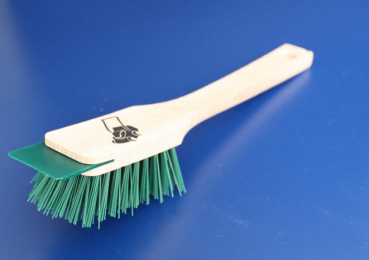 o Vorne an der Bürste ist eine Kunststoff Schabkante in Grün angebracht, mit der arger Schmutz abgeschabt werden kann.